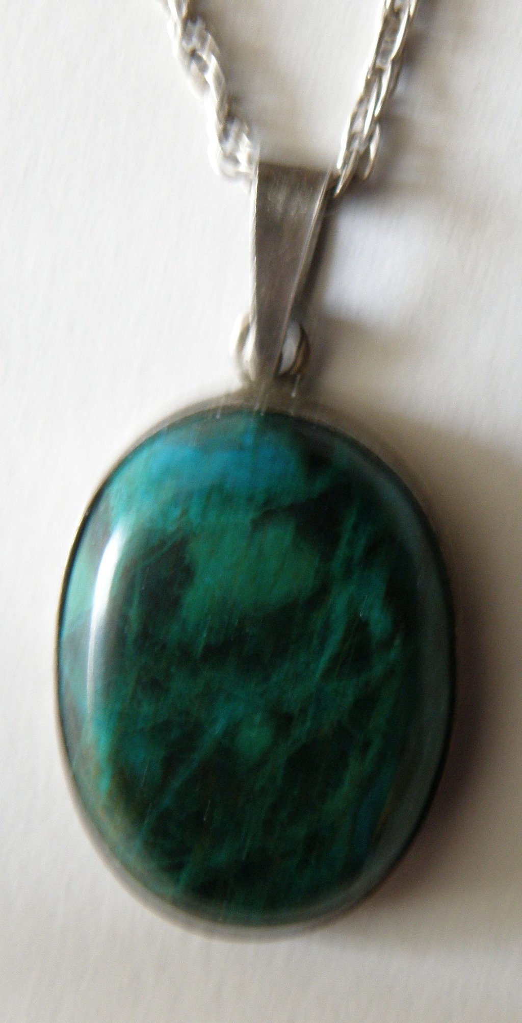 Plastic imitations feel warm and lightweight and often show molded seam lines. Genuine chrysocolla feels cool and slightly heavier, with natural color variation that is difficult to replicate uniformly.